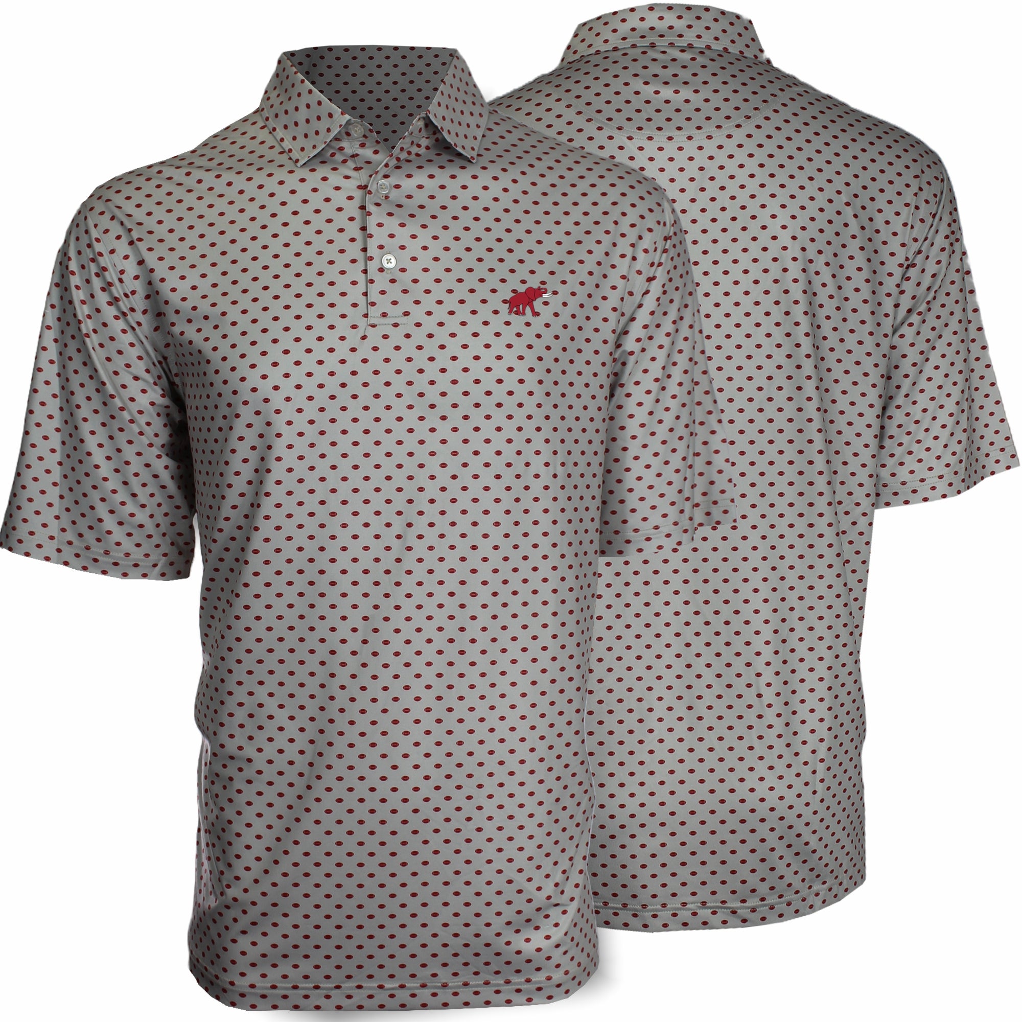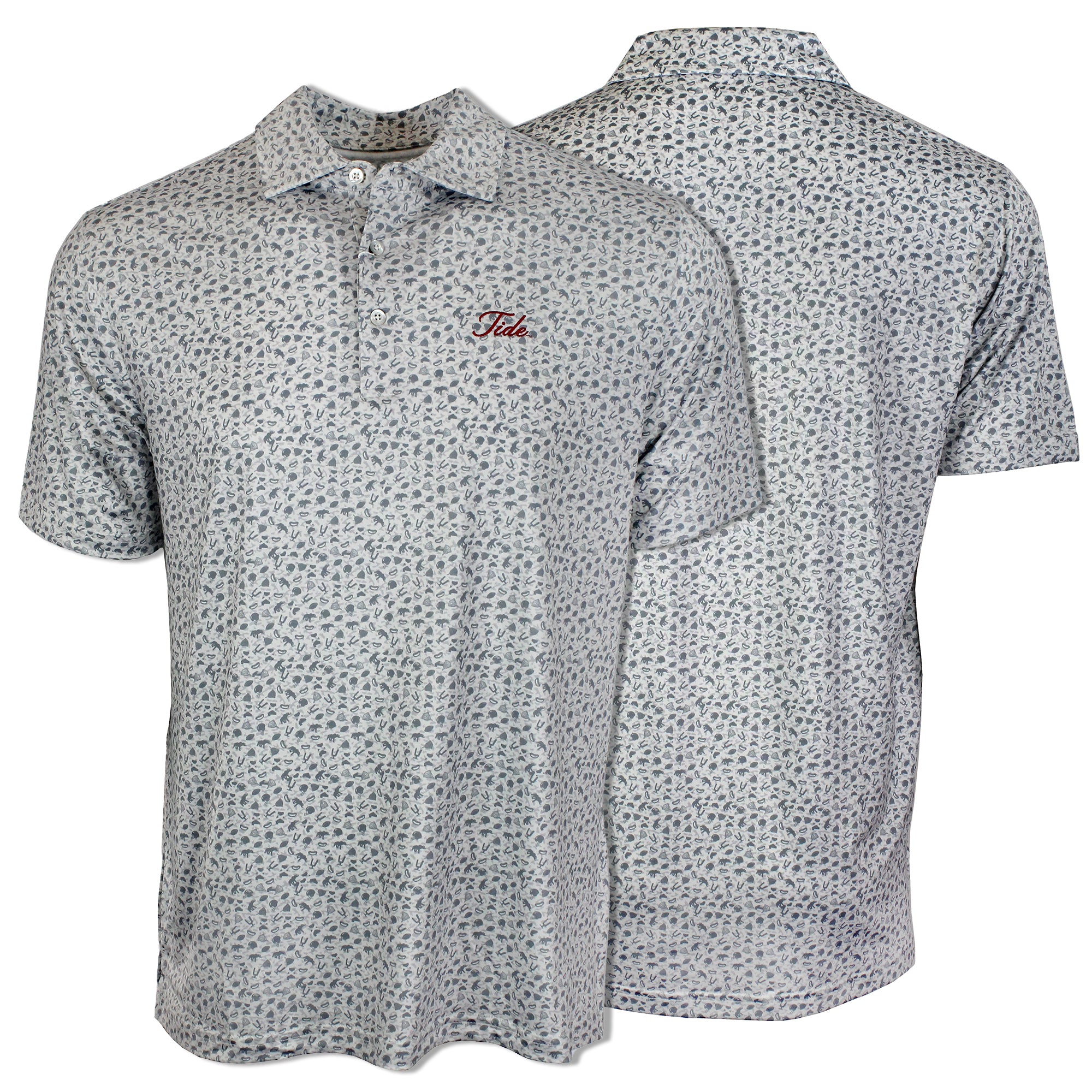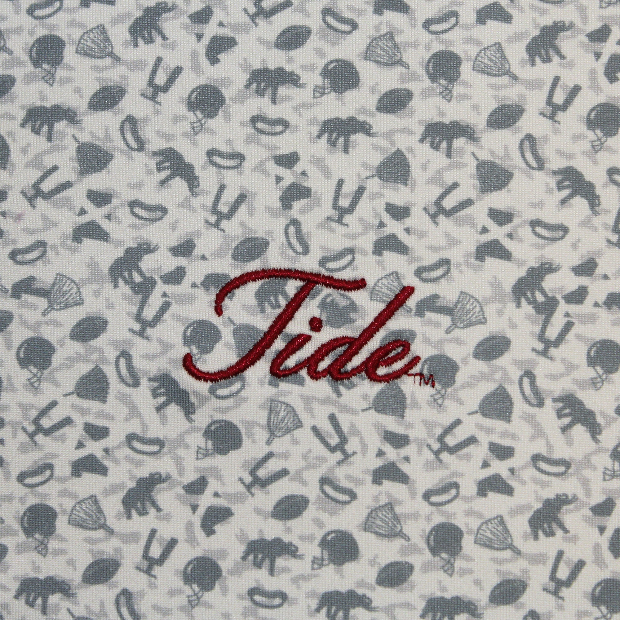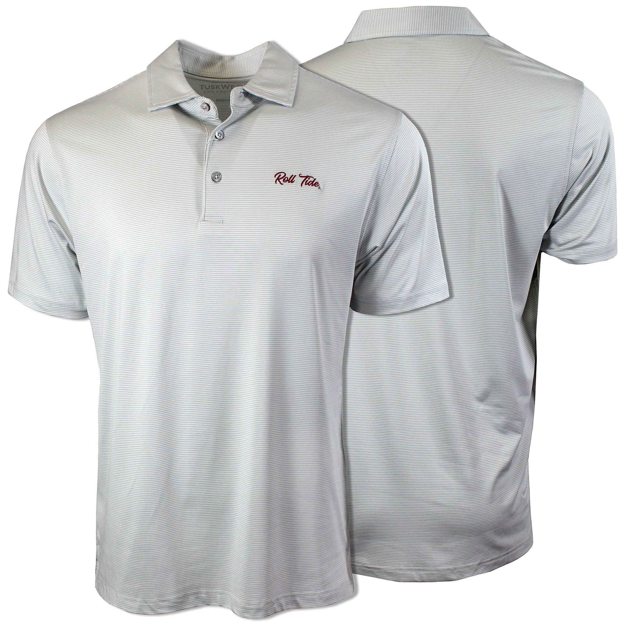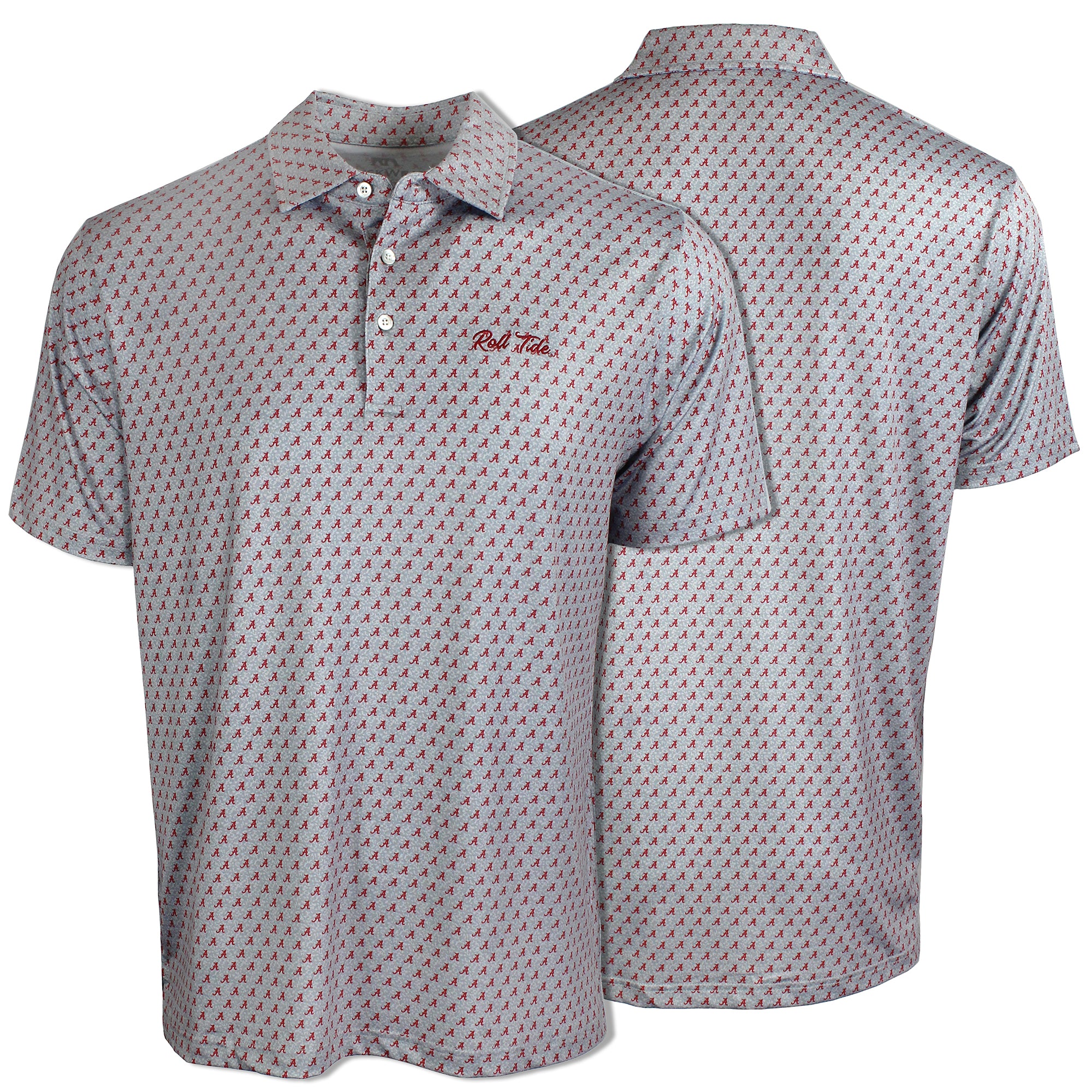 94% Polyester / 6% Spandex-Pique Self collar 3 Button placket Custom fit: Not too slim, not too loose Tide Hoops embroidery on Crimson/Grey; Bama Basketball...