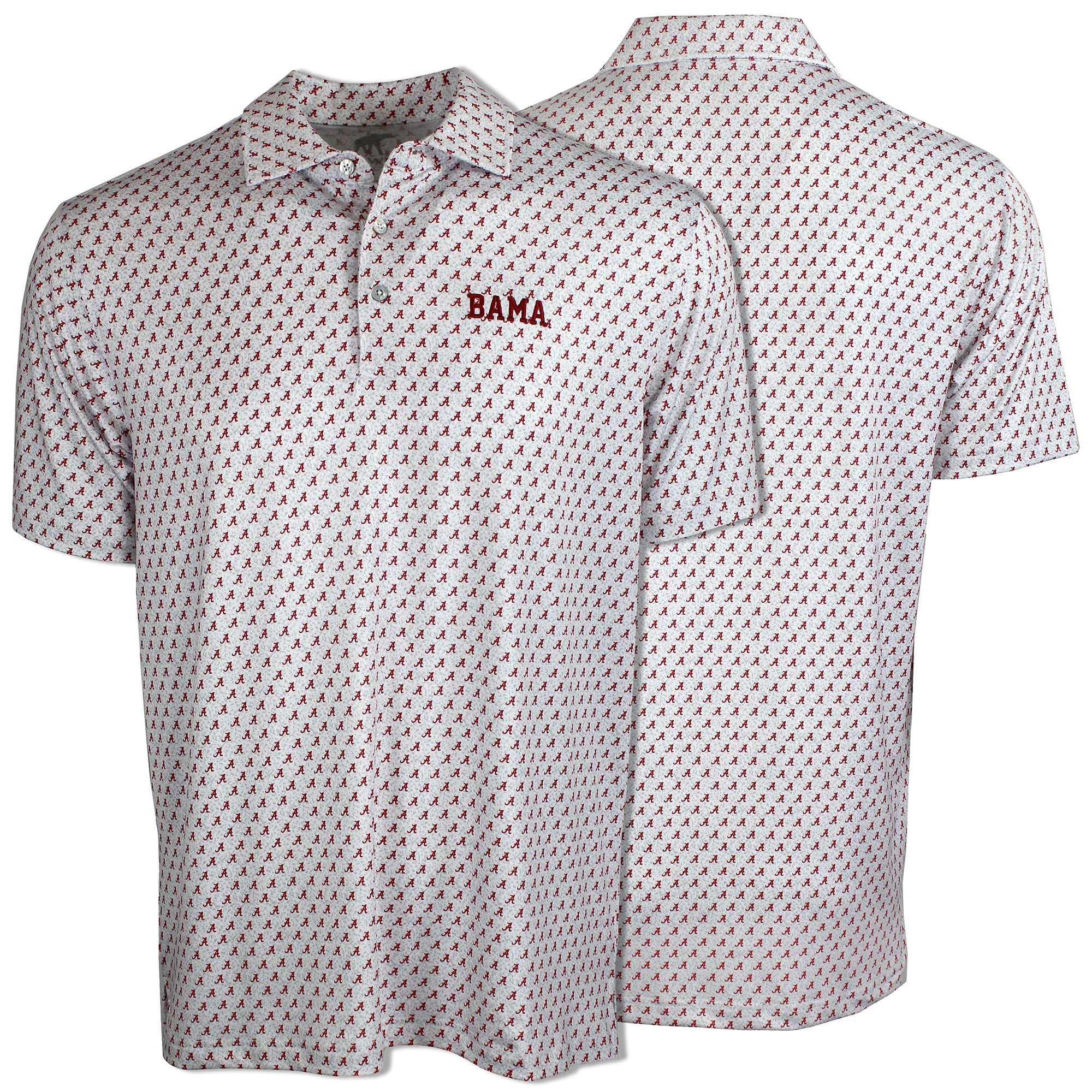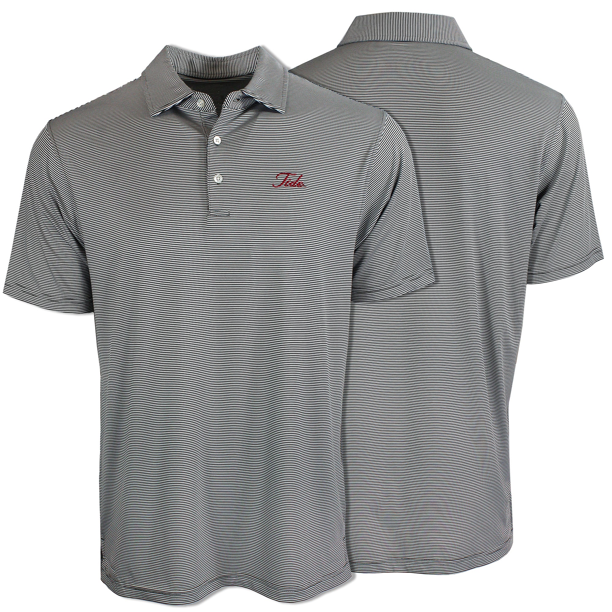92% Polyester / 8% Spandex-Pique Self collar 3 Button placket Custom fit: Not too slim, not too loose Tide Hoops embroidery on Bay/Slate/White; Bama Basketball...